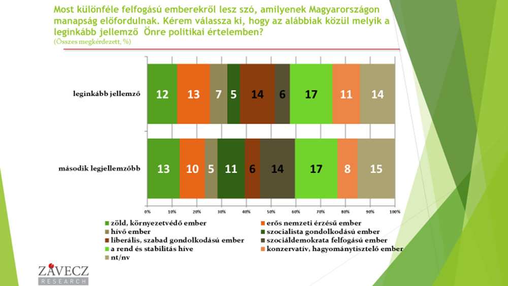 A választók világnézeti meggyőződését tekintve pontosan egynegyedük sorolta magát összességében (első vagy második helyen) a zöld, környezetvédő emberek közé: az emberek 12 százaléka számára a zöld értékrend elsődleges identitásképző szempont a politika világában; 13 százalékának a másodlagos. A legtöbben ma Magyarországon, amikor politikai-ideológiai önmeghatározást adnak, a rend és stabilitás hívének tartják magukat (összesen 33 százalék). A már említett zöld, környezetvédő önbesorolás a második leggyakoribb (25 százalékkal), s utána szorosan követi egymást „az erős nemzeti érzésű”, a szociáldemokrata”, a konzervatív, hagyománytisztelő” és a „liberális, szabad gondolkodású” önmeghatározás – 23, 21, 20 és 19 százalékkal. Szocialistaként 15, hívőként 12 százalék sorolta be magát első vagy második helyen.