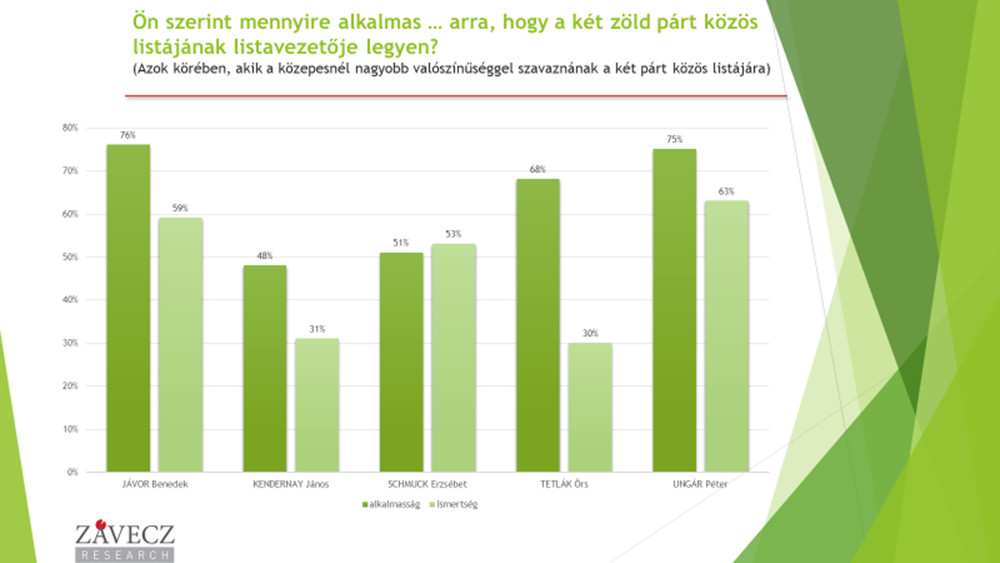 A kutatók rákérdeztek arra is, hogy egy-egy konkrét listavezető megnevezése hogyan befolyásolná a közös zöld listára szavazás valószínűségét. Úgy tűnik, a két pártnév fémjelezte listához képest egyik listavezetőnek sincs komoly hozzáadott értéke: a 7-es skálán az eredeti 3,2-es érték Jávor listavezetése esetén 3,1, Ungár listavezetésével 3,0 lenne – mégsem mondhatjuk, hogy a listavezető személyének nincs jelentősége, mert például Schmuck Erzsébettel már csak 2,8 pontot kapna a zöld lista a választóktól; a potenciális (átlagosnál nagyobb valószínűséggel) zöld szavazók aránya Jávorral 24 százalék, Ungárral 23 százalék, Schmuckkal 19 százalék lenne.