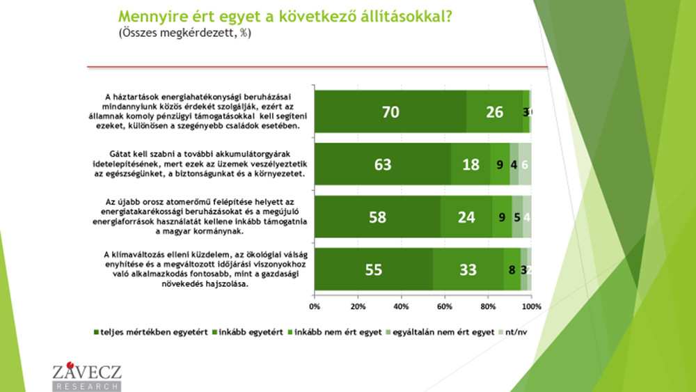 Régóta masszív támogatásra számíthatnak a magyarok között a zöldek közpolitikai javaslatai, és ez a most vizsgált négy állítás esetén sem volt másként. 100-ból 96-an teljes mértékben vagy inkább egyetértenek a háztartások energiahatékonysági beruházásainak állami támogatásával, 88 százaléknyian tartják fontosabbnak a klíma- és ökológiai válság enyhítését a gazdasági növekedésnél, 82 százalék a megújuló energiákat támogatja Paks2 helyett, és 81 százalék utasítja el további akkumulátorgyárak hazánkba telepítését – derült ki az ezer fő telefonos megkérdezésével készült reprezentatív kutatásból.