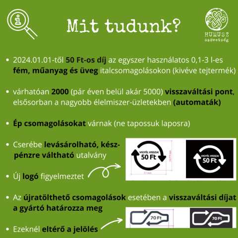 2024. január 1-jétől 50 forintot kell majd fizetnünk az egyszer használatos, 0,1–3 liter űrtartalmú italcsomagolások (a PET-palack, az alumínium doboz és az üveg palackok, kivéve a tej és tejalapú italtermékek csomagolásai) után. Az összeget akkor kapjuk vissza, ha visszaváltjuk a csomagolásokat a nagyobbélelmiszerüzletekben elhelyezett mintegy 2000 automata egyikében. A legalább 400 négyzetméteres eladóterű boltok számára kötelező lesz az automaták üzembe helyezése esőtől, széltől védett helyen – a bolt nyitvatartási idejében. A visszaváltási pontokat meghibásodás esetén – akár kézi erővel is – kötelező lesz működtetni.