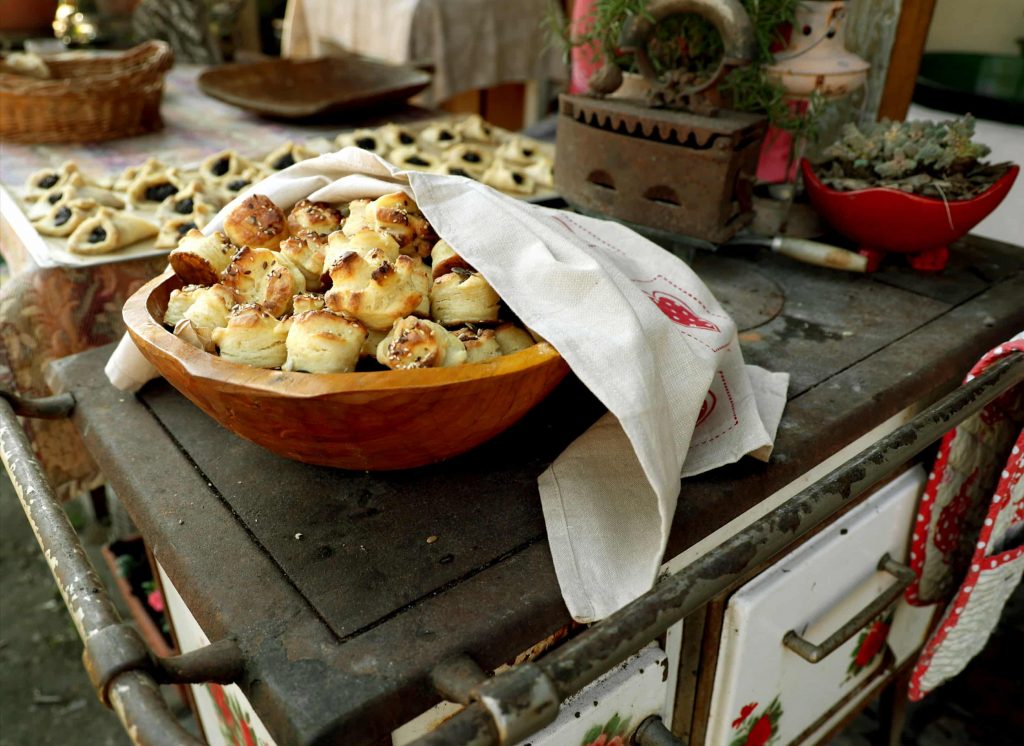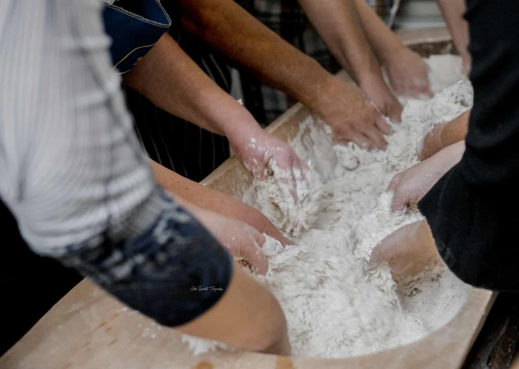 A klasszikus kovászos kenyér mellett gyakran készítek gyökérkenyeret is. Ez volt az első, amit megtanultam, még mielőtt belevágtam volna az igazi kovászosba. Pirike nénitől tanultam a receptet. A gyökérkenyér kicsit könnyedebb, élesztős változat, de a formája és a textúrája különleges. Olyan, mint egy finom átmenet a kenyér és a kalács között. A kemence ebben is csodát művel: aranybarna héj, illatos, foszlós bél – a vendégek mindig nagy kedvvel viszik haza.