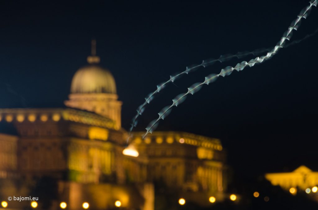 Dunavirágok röpte a Budai vár előtt. A fotó hosszabb záridővel készült, így a pesti oldalon, lámpafényben repülő két egyed mozgásainak fázisait lehet látni a képen.