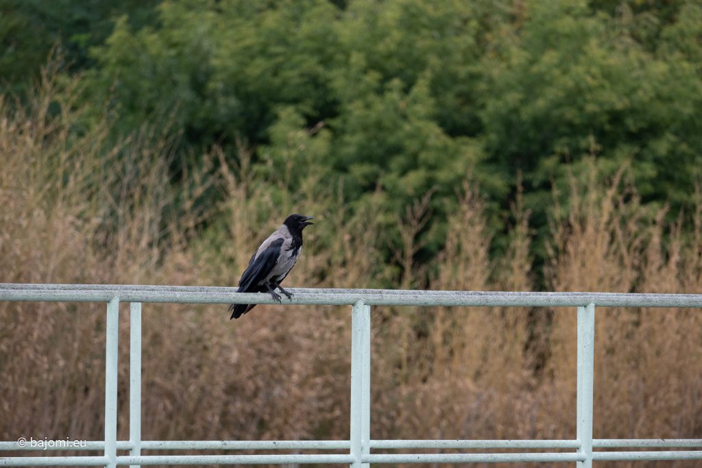 Varjú az előülepítő kotróhídjának korlátján. Érkezésünkkor legalább öt madarat zavartunk fel, de egy ott maradt nekem pózolni.
